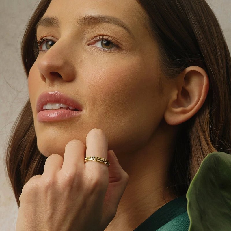 At the heart of this design lies a delicate rose gold inset, shimmering with the warmth of rare Welsh gold. Subtly incorporated within the weave, the Welsh word "Annwyl," meaning "beloved," adds a deeply personal touch, making this ring a truly unique and cherished keepsake.