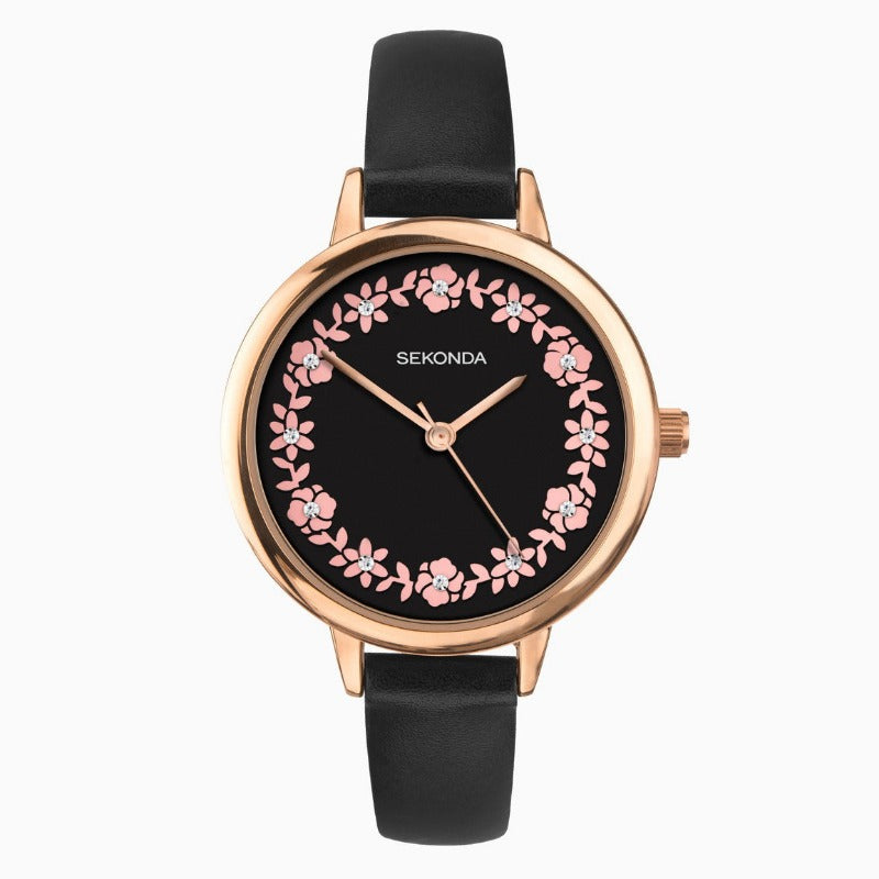 This Sekonda watch boasts a striking black dial adorned with delicate pink floral motifs and sparkling stones, all protected by a resilient mineral crystal.