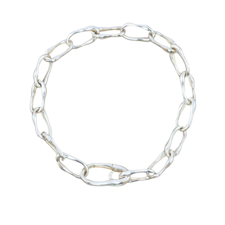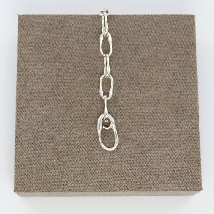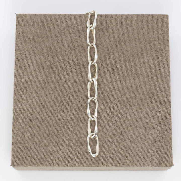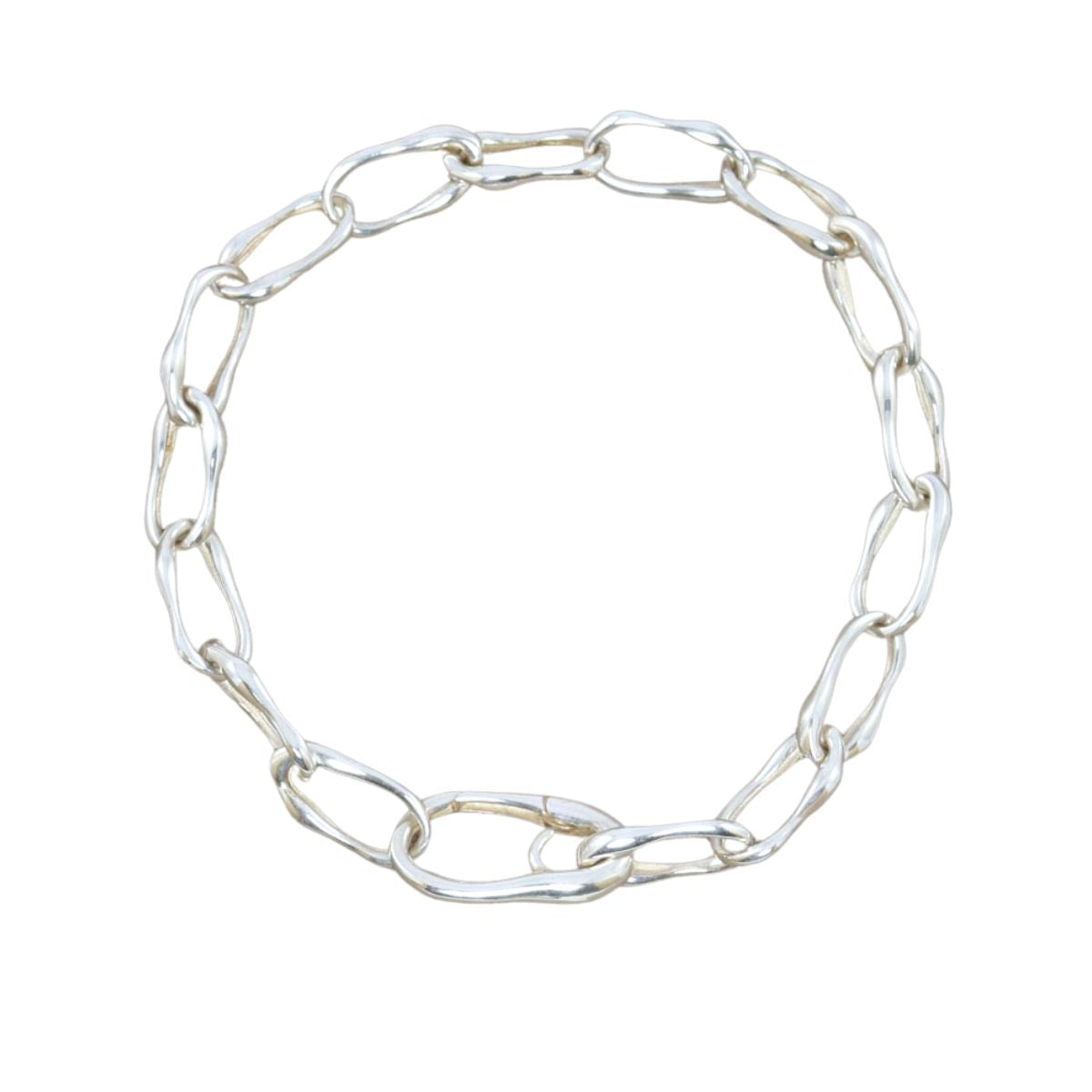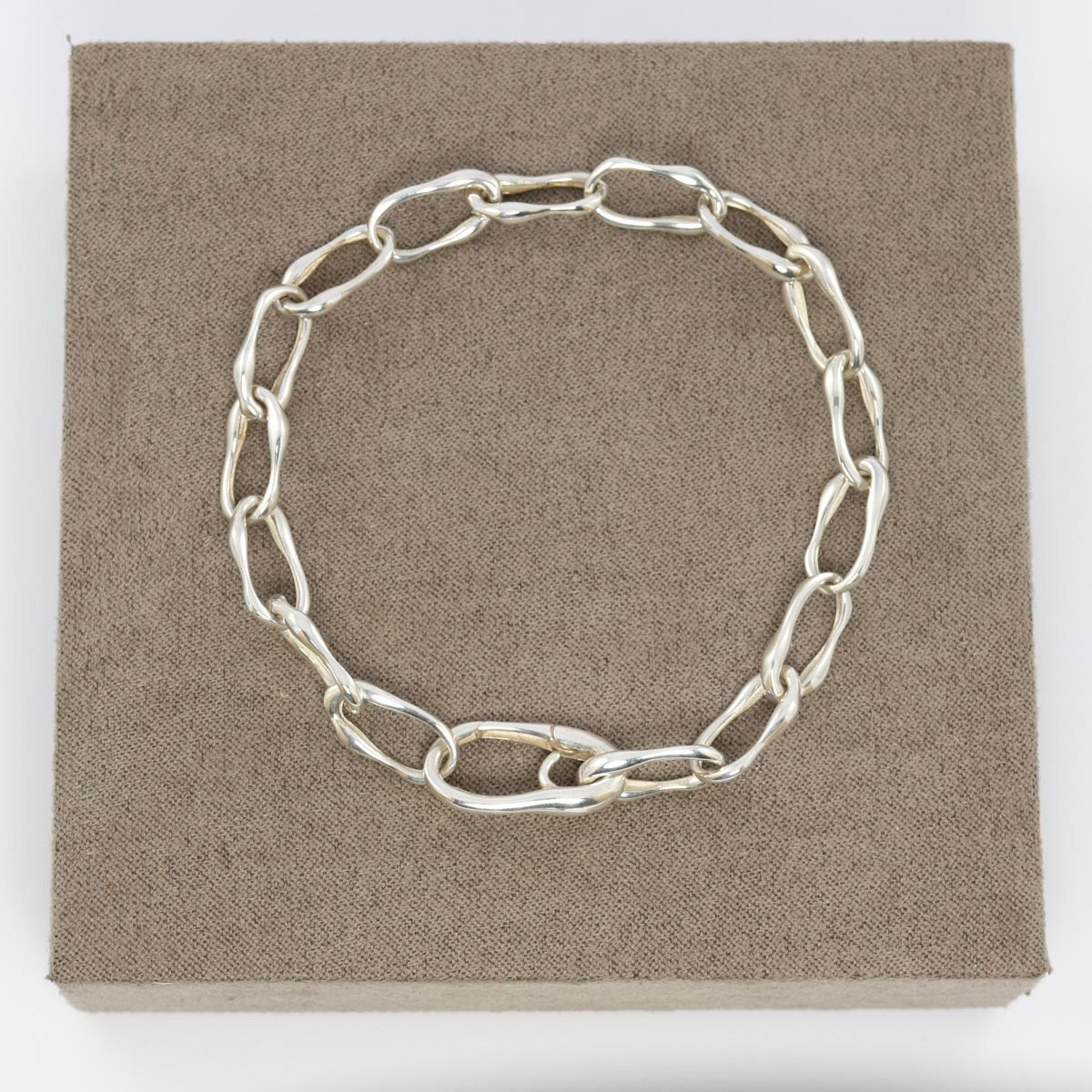 Crafted from gleaming sterling silver, this bracelet drapes elegantly with a series of interconnected oval links.