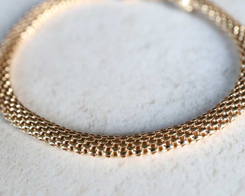It's crafted from gold-plated sterling silver, giving it a luxurious sheen and enduring quality. The unique popcorn link design is formed from intricately soldered silver spheres, creating a textured and eye-catching piece.