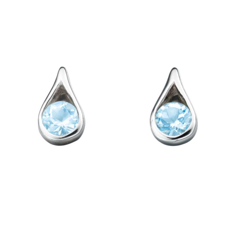 These elegant stud earrings, crafted from polished sterling silver, showcase the captivating allure of teardrop-cut blue topaz.