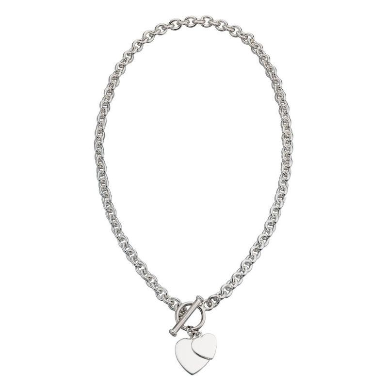 Crafted from gleaming sterling silver, this necklace features two polished heart charms, the larger of which can be engraved with a message of your choice. It fastens securely with a classic T-bar and the 41cm chain offers a versatile length, further enhanced by a 5cm extender for adjustable wear.