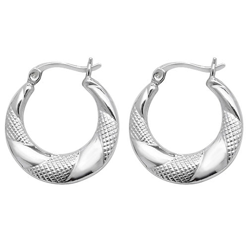 These creole earrings, crafted from gleaming sterling silver, offer a unique blend of classic style and contemporary design. Their saddle-fitting clips ensure a secure and comfortable fit, while the intricately patterned surface adds a touch of modern elegance.
