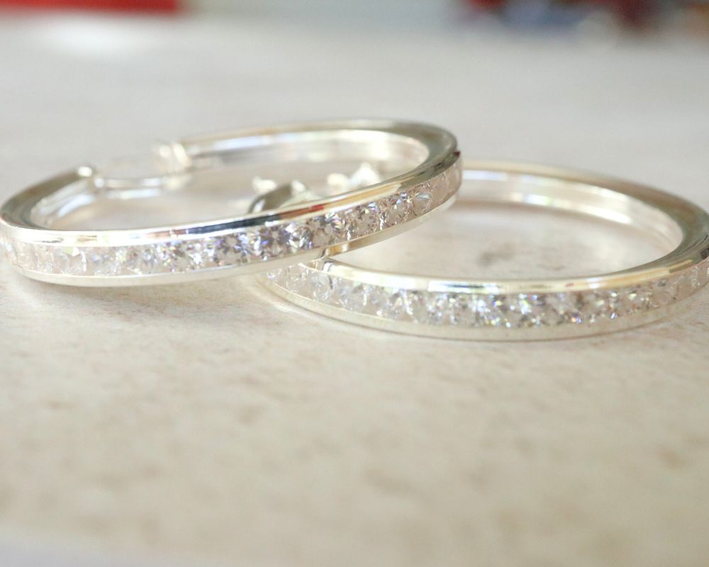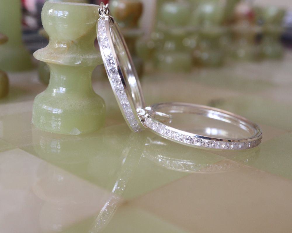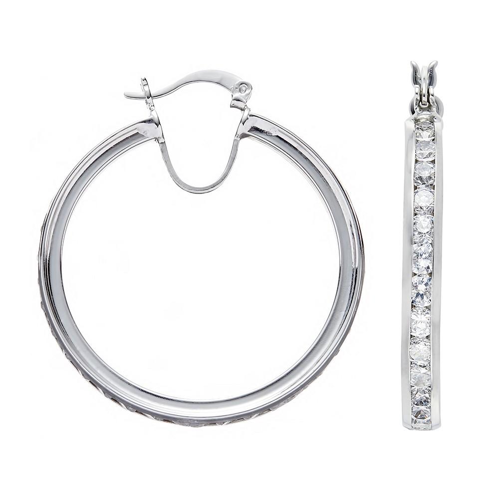 Crafted from gleaming sterling silver, these hoop earrings possess a timeless elegance. Their classic silhouette is beautifully enhanced by a channel setting, showcasing the dazzling sparkle of cubic zirconia stones.