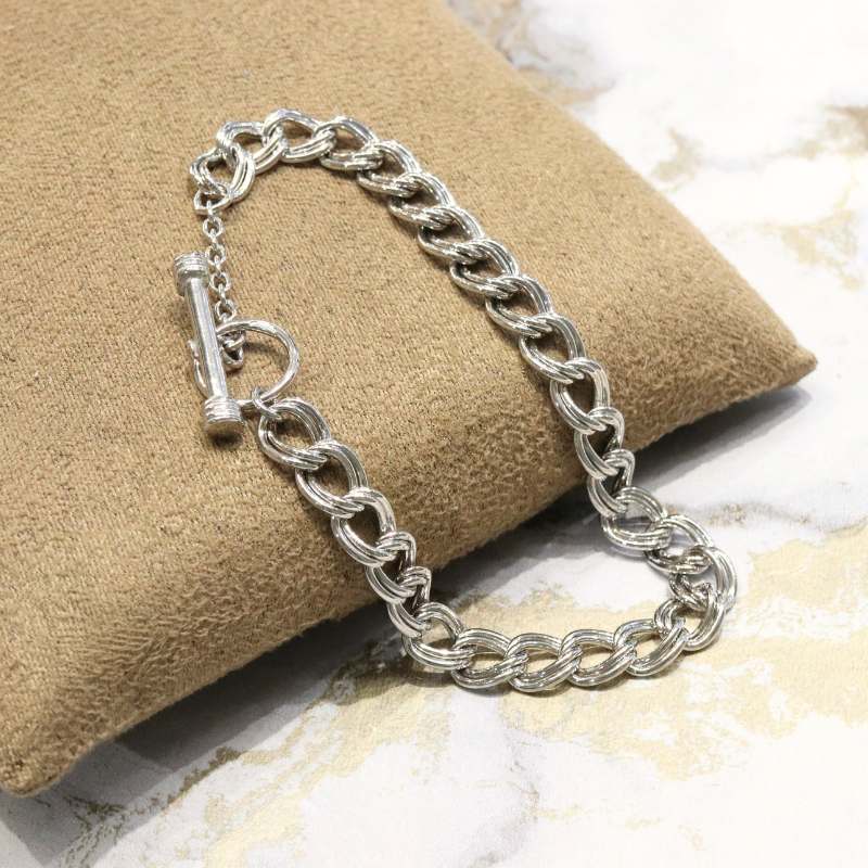 This bracelet boasts a striking double curb link design, a classic style that exudes timeless elegance.