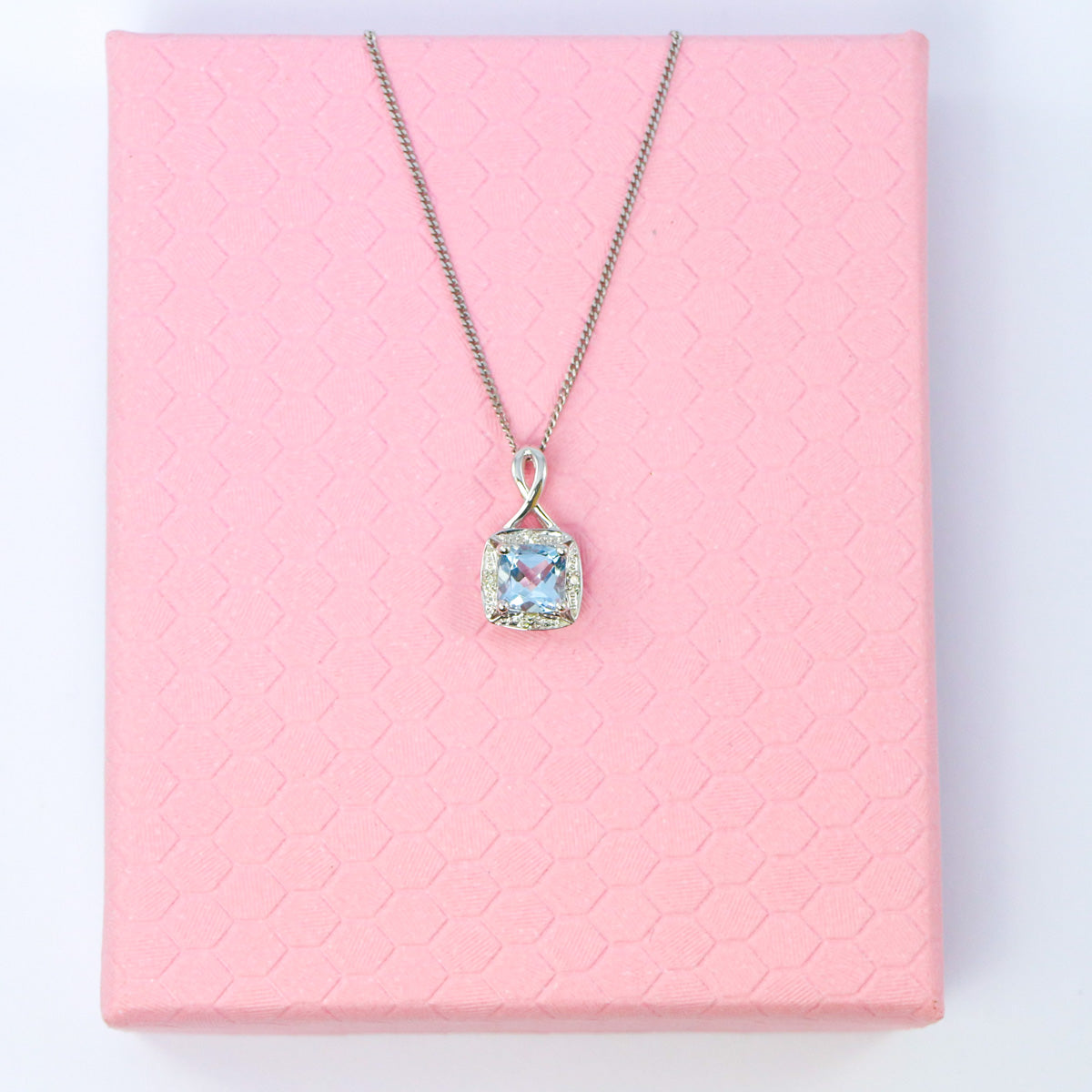 Discover our exquisite Ladies' 9ct White Gold Aquamarine & Diamond Pendant, a truly captivating piece. This stunning pendant features a beautiful cushion-cut aquamarine gemstone, renowned for its serene blue hue, which is elegantly fringed with a halo of sparkling diamonds.