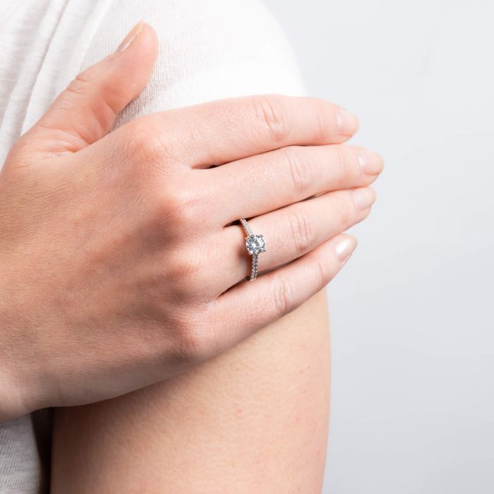 This ring is crafted from sterling silver, featuring a central, oval-shaped stone held securely within a classic four-claw setting. The shoulders are gracefully set with a series of brilliantly cut and polished Diamonfire zirconia, creating an unbroken line of light that draws the eye.
