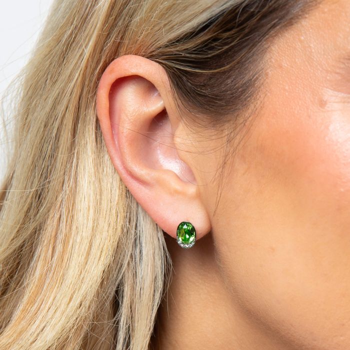 These exquisite oval stud earrings are crafted in platinum plated recycled sterling silver and feature peridot crystals with a captivating hue. Adorned with dazzling cubic zirconia details, these sparkling earrings are the perfect accessory to elevate any outfit, especially when paired with the matching pendant. A perfect gift, you will not want to miss this elegant style!