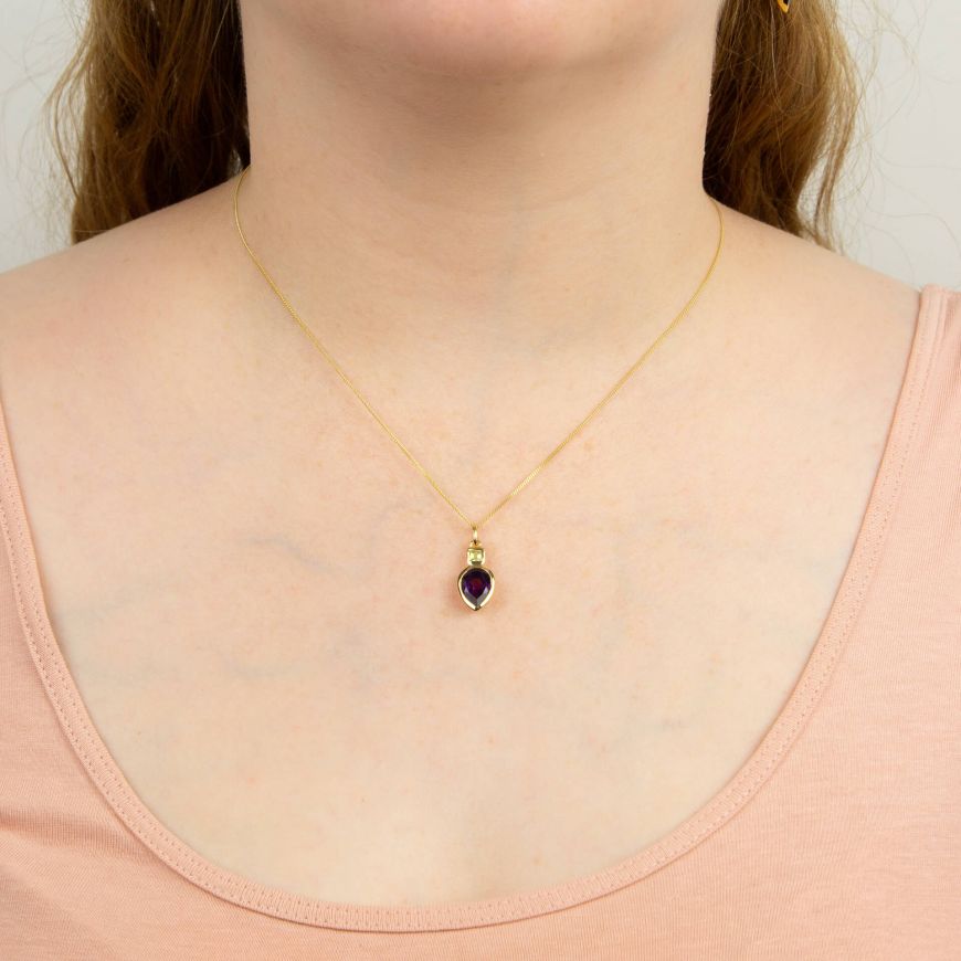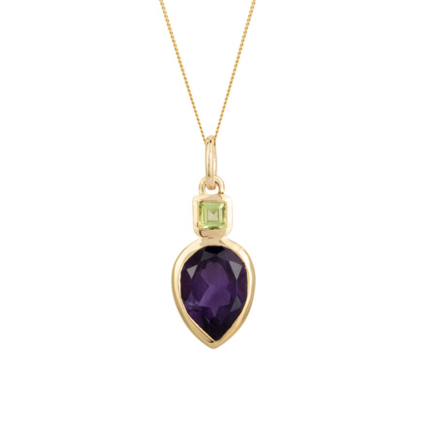This elegant pendant, crafted from gold-plated sterling silver, boasts a captivating combination of gemstones. A luscious teardrop amethyst takes centre stage, its deep violet hues beautifully complemented by the vibrant green of a precisely cut square peridot.