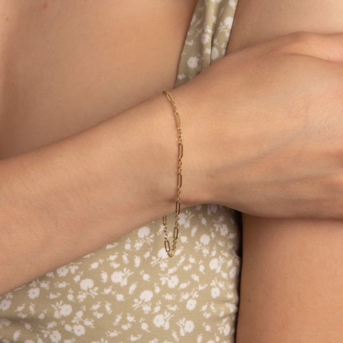 This ladies' bracelet, crafted from gleaming 9ct gold, boasts a unique solid link design. The links themselves are a captivating blend of classic figaro and contemporary paperclip styles, creating a piece that's both timeless and modern.