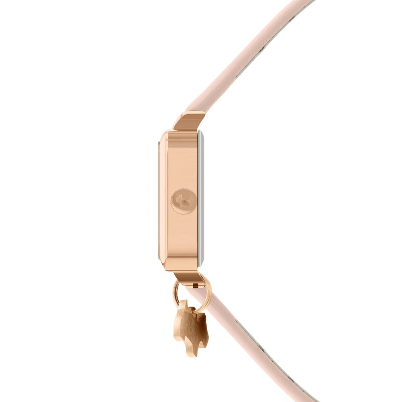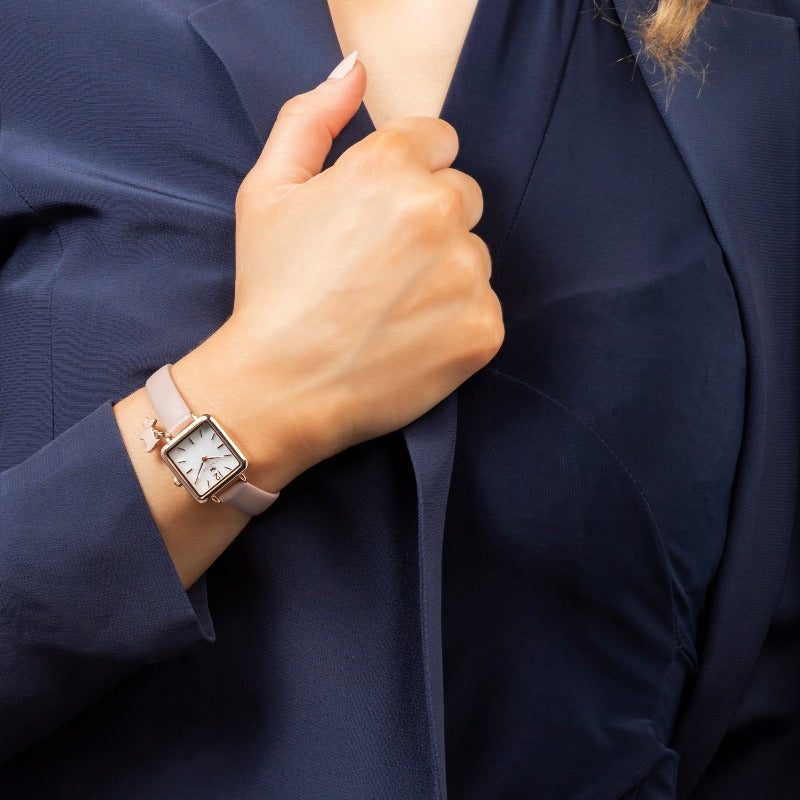Encased in warm rose gold-plated stainless steel, this timepiece offers a touch of modern elegance. Its square face, framed by the soft sheen of mother-of-pearl, creates a captivating contrast.