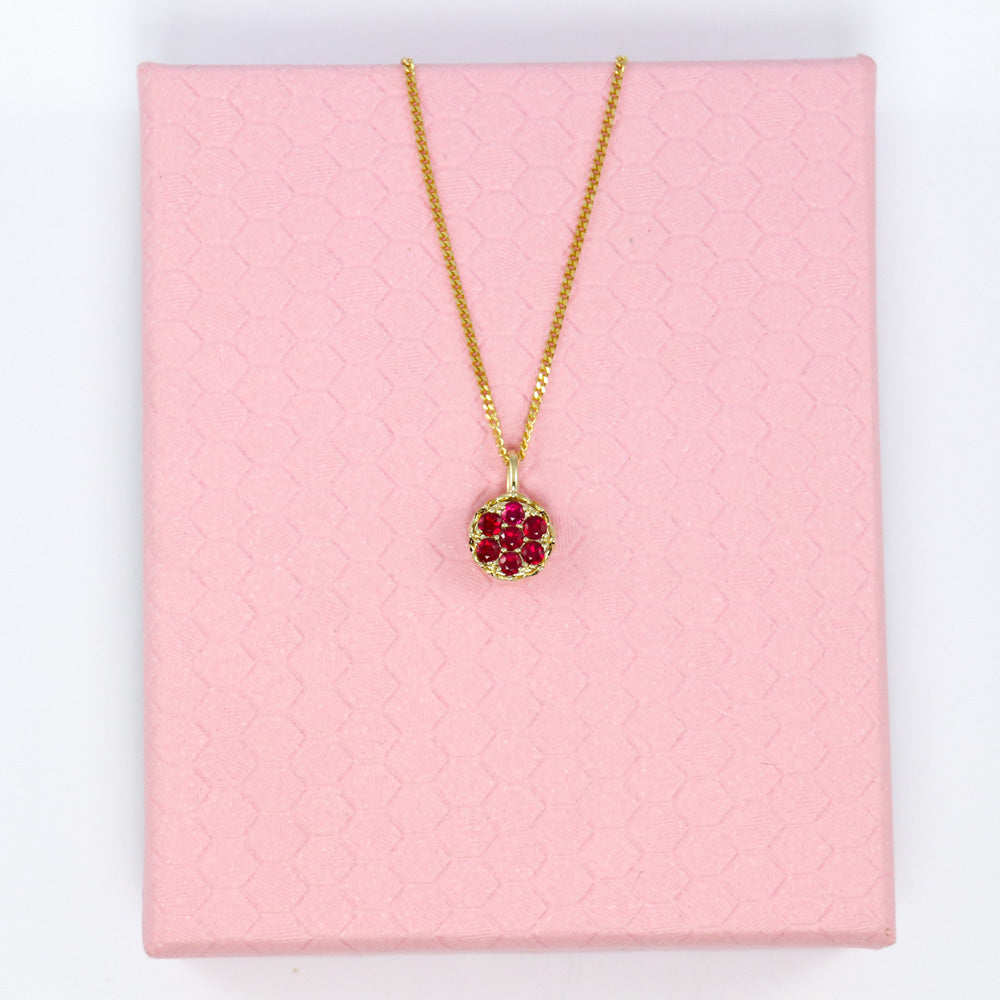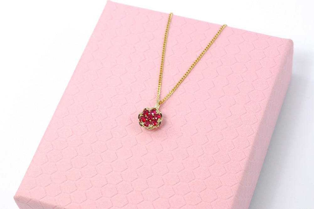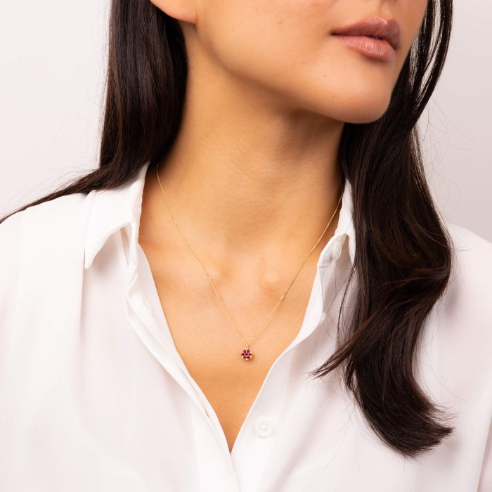 Presenting our beautiful Ladies' 9ct Gold Ruby Cluster Flower Pendant. This exquisite pendant features a delightful flower design, meticulously set with seven vibrant ruby gemstones that radiate a rich red hue.