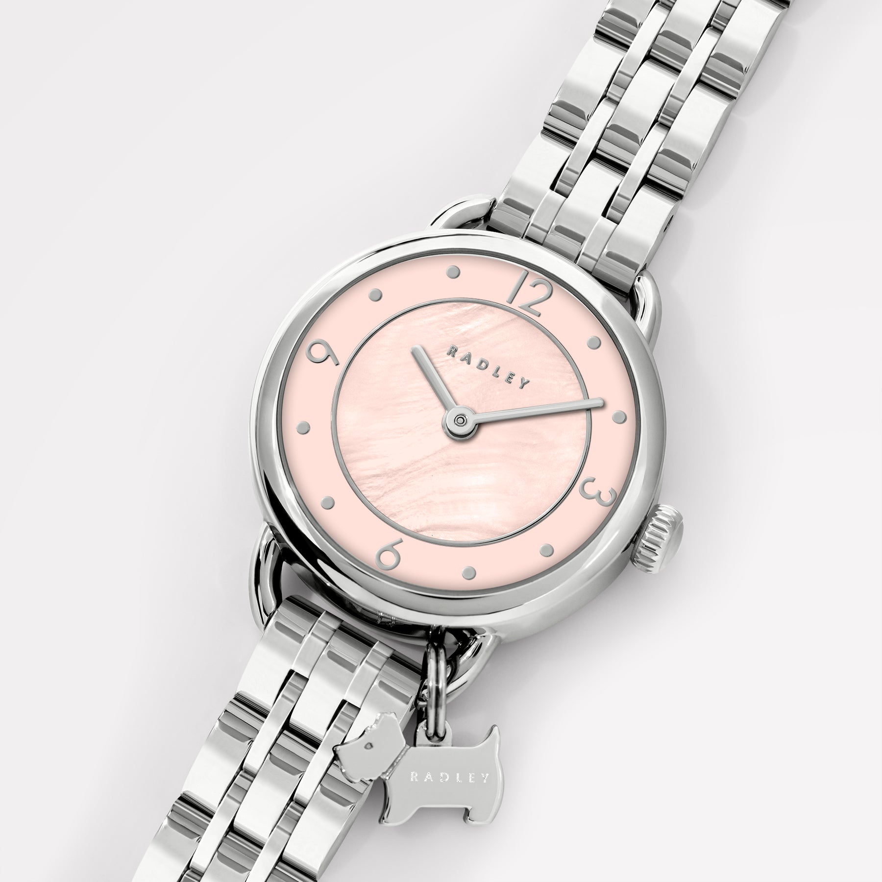 This ladies' watch is designed around a dial of pink mother of pearl, its surface catching the light with a soft iridescence. The dial is framed by a petite 26mm case, finished in a silver tone that extends into the matching bracelet.