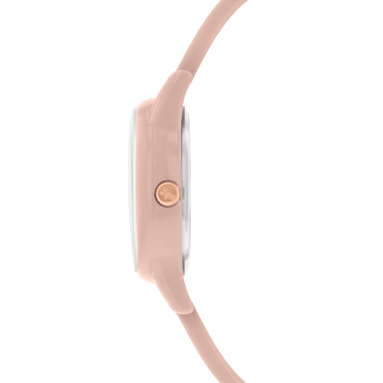 The design's harmony continues with a comfortable silicone strap, rendered in the same Cobweb Pink for a seamless, modern profile. This analogue timepiece is protected by durable mineral glass and secures with a simple toggle clasp.