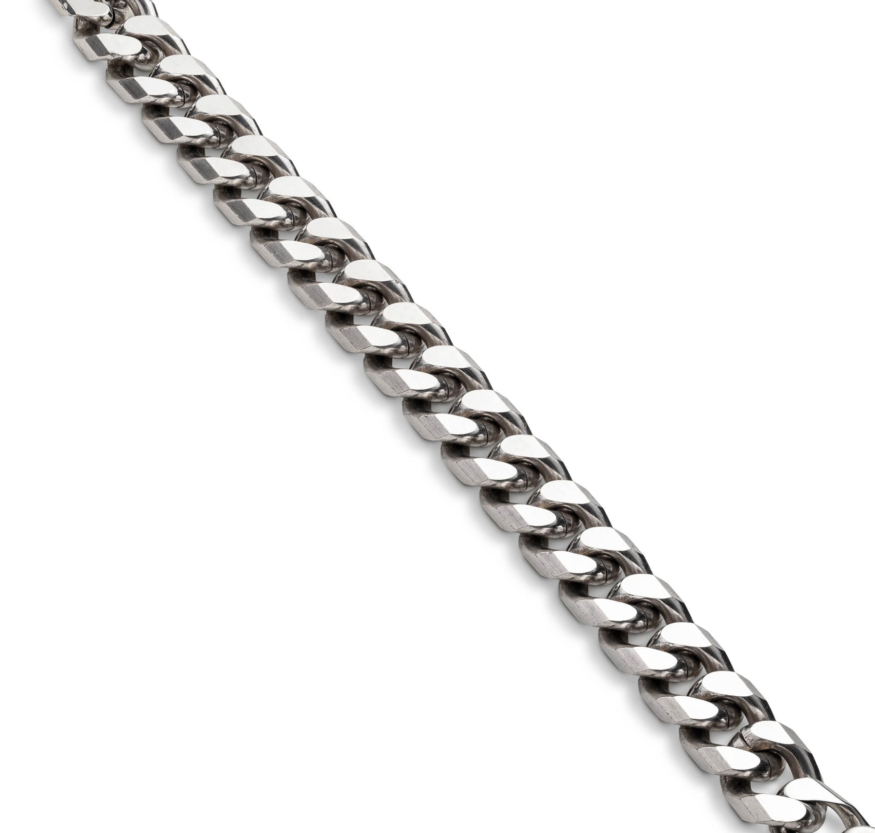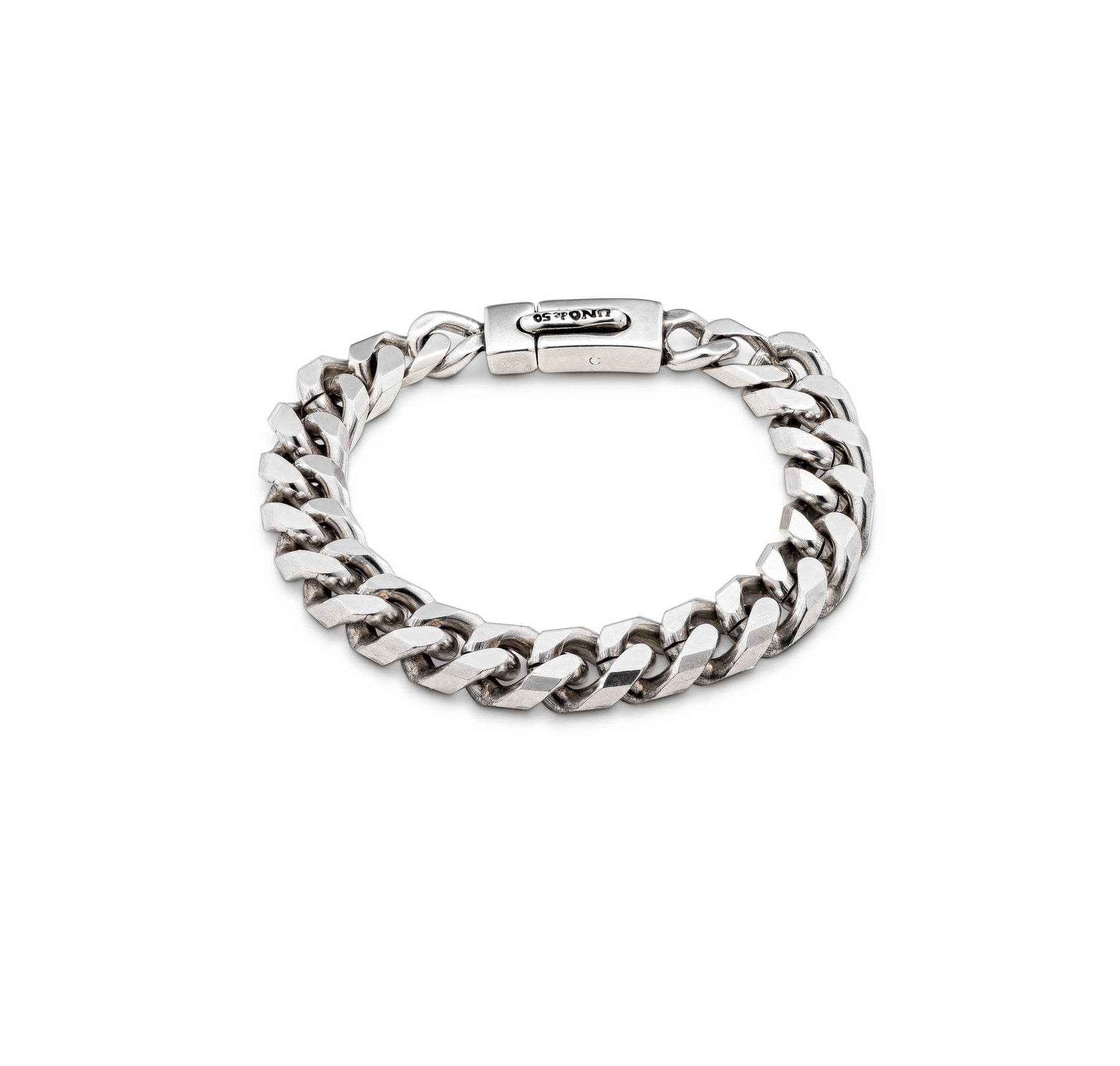 This Uno de 50 men's bracelet, handcrafted in Madrid, boasts a striking design of interlocking curb links, giving it a substantial and masculine feel. The secure automatic push-style clasp ensures it sits comfortably and safely on the wrist. Measuring 20.5cm in length, it's plated with 15 microns of silver – a generous layer that provides a rich, lustrous finish and enduring quality.