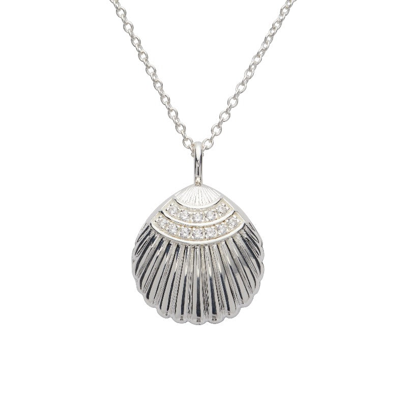 Crafted from gleaming sterling silver, this locket captures the timeless beauty of the ocean with its delicate shell motif. The shell itself is framed by a double row of sparkling cubic zirconia stones, adding a touch of brilliance to the design.