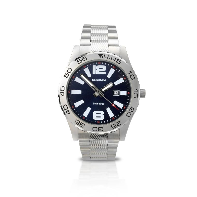 This Sekonda men's watch boasts a striking blue dial, accented by crisp white batons and luminous hands that ensure effortless time-telling, even in low light.