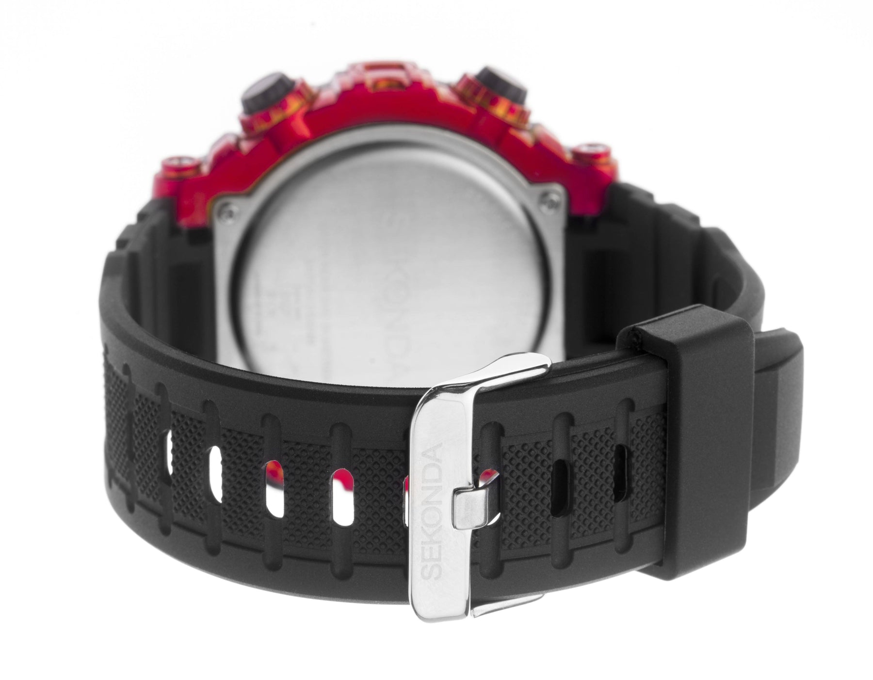 The Sekonda 1525 is a stylish digital watch designed for men, featuring a sleek black plastic case and strap, accented with vibrant pops of red.