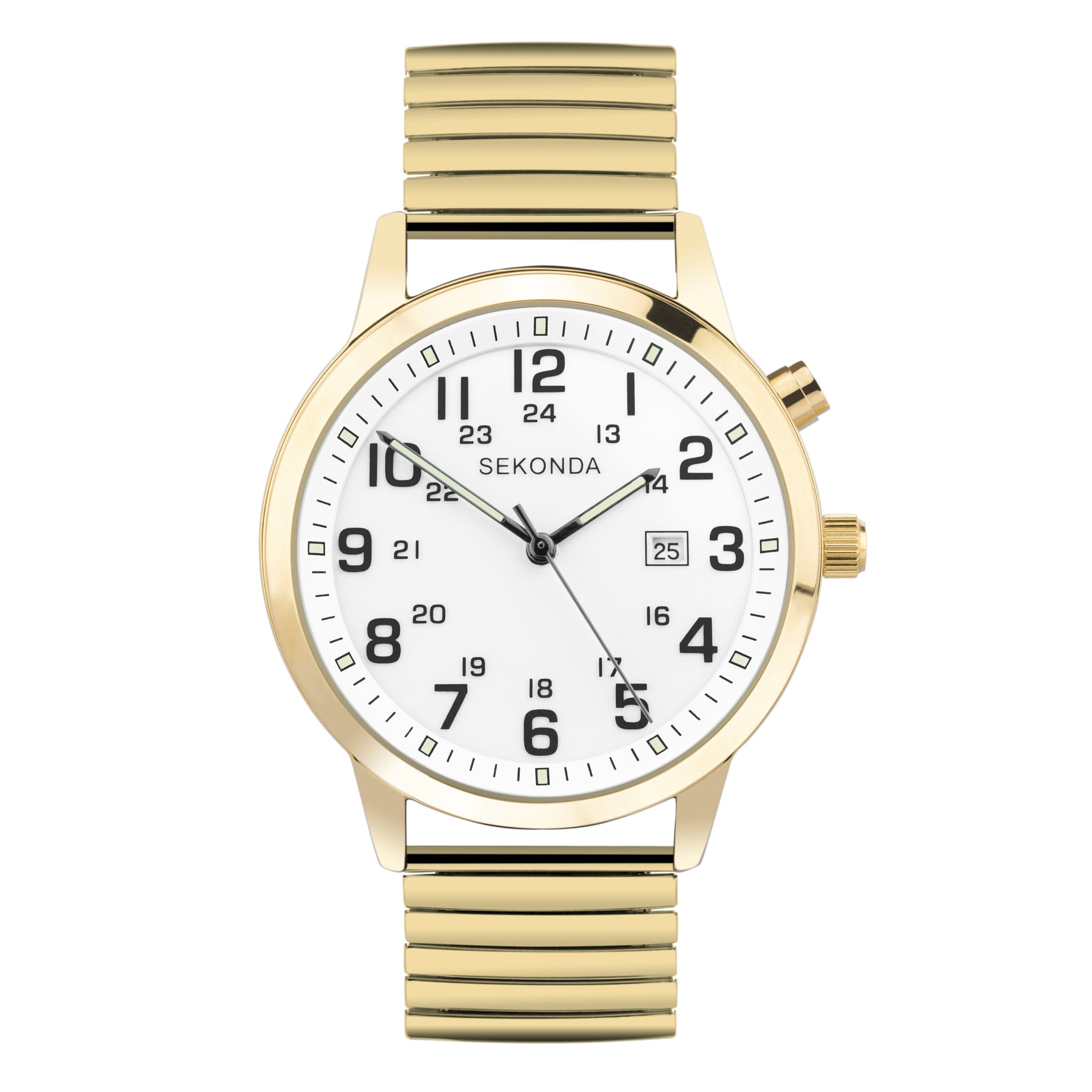 This timepiece offers both practicality and comfort. The easy-to-read dial features a helpful second hand and a date window discreetly placed at the 3 o'clock position, so you'll always be on time and in the know. The back-light is a great bonus for many wearers. Plus, the expanding bracelet ensures a perfect fit for any wrist. We also have a silver coloured version, or one with a black leather strap.