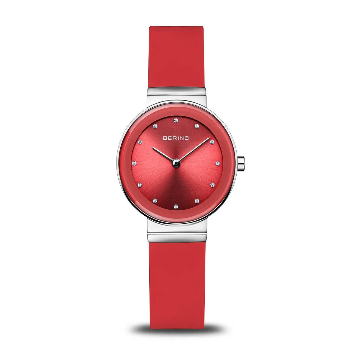 This Bering Classic ladies' watch is a timeless piece, featuring a shimmering Milanese mesh bracelet crafted from red stainless steel. The bracelet's clever design allows for effortless adjustment, ensuring a perfect fit on any wrist.