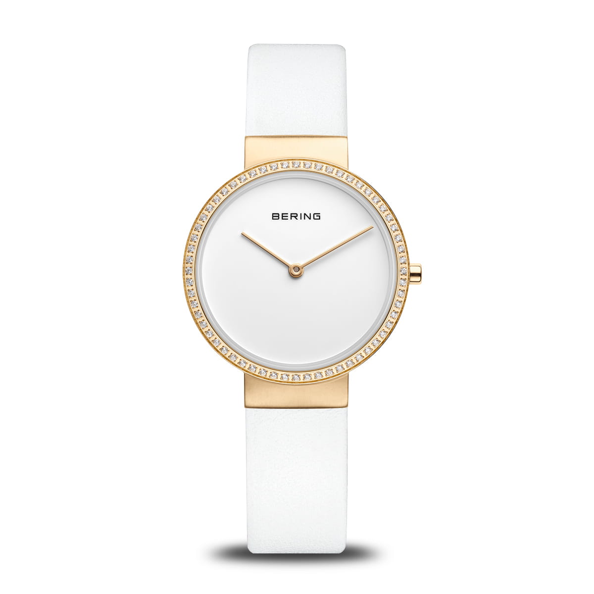 This Bering ladies' watch, model 14531-630, is constructed with a polished gold-plated stainless steel case that frames a clean, white minimalist dial.