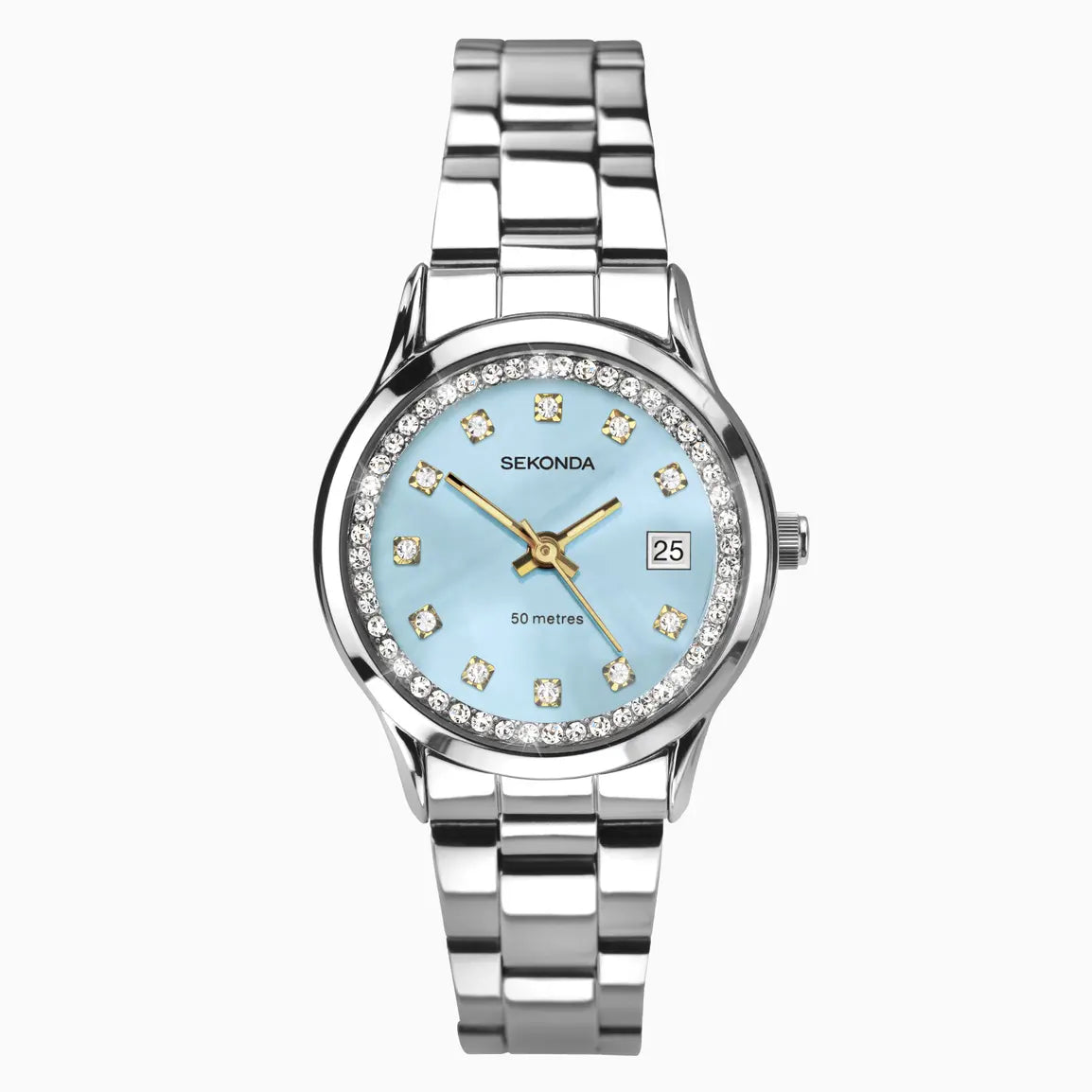 This watch features a round, silver-coloured case which frames a light blue mother of pearl dial. The iridescent dial surface is detailed with clear crystals and includes a practical date display.