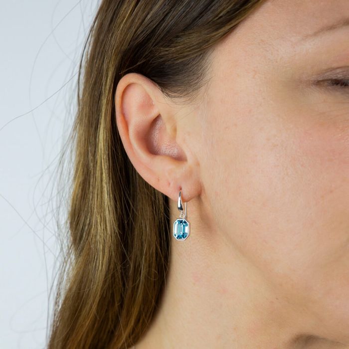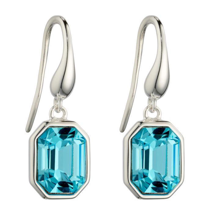 These elegant drop earrings, crafted from gleaming sterling silver, showcase the cool brilliance of light blue Asscher-cut crystals.