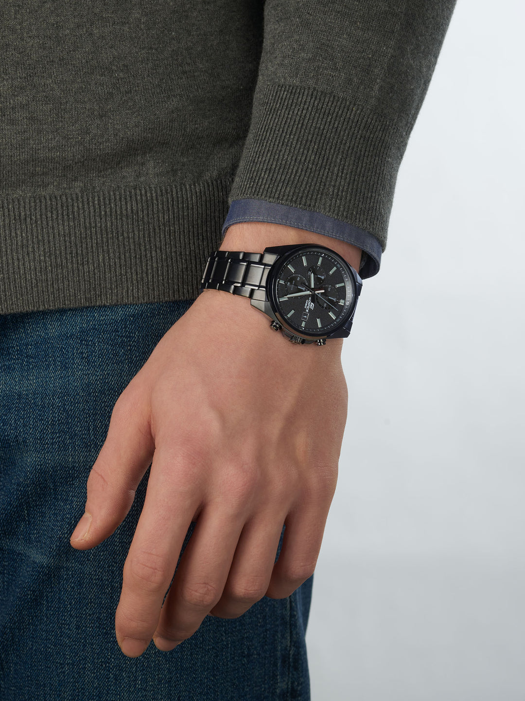 The bracelet, crafted from robust stainless steel and enhanced with sleek black ion plating, not only looks impressive but also promises lasting durability. And with 100-meter water resistance and a secure screw-down crown, this timepiece is ready for anything life throws your way.