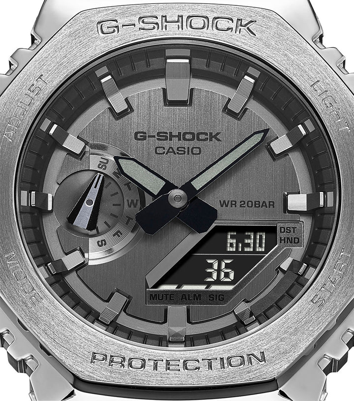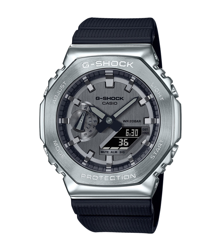 The Casio G-Shock GM-2100-1AER is a men's watch built to withstand the demands of an active life. Its striking octagonal bezel, crafted from stainless steel with a subtle hairline finish, frames a dial with a captivating metallic sheen, a result of innovative vapor deposition technology.