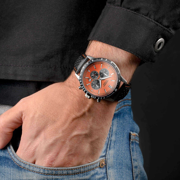 Introducing the Sekonda Velocity Chronograph, a men's watch designed for those who appreciate both style and precision. Its vibrant orange dial immediately catches the eye, complemented by three black sub-dials that offer more than just good looks. These sub-dials track chronograph timing up to one hour, provide a 24-hour readout, and display the date, ensuring you're always in control of your time.