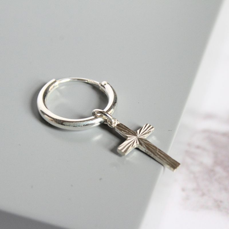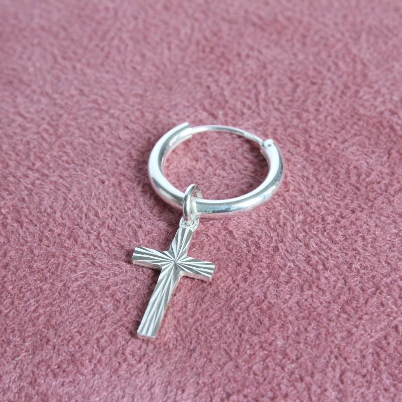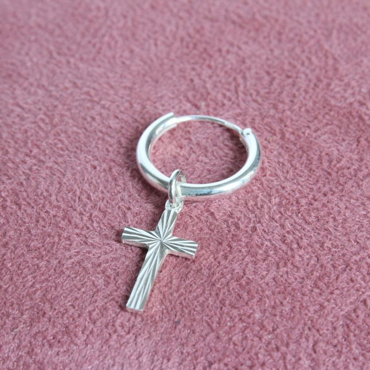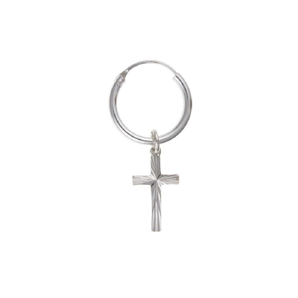 These striking hoop earrings, each measuring 15mm, feature a beautifully suspended cross pendant. The pendant itself, at 20mm, adds a touch of modern elegance to the classic hoop design.