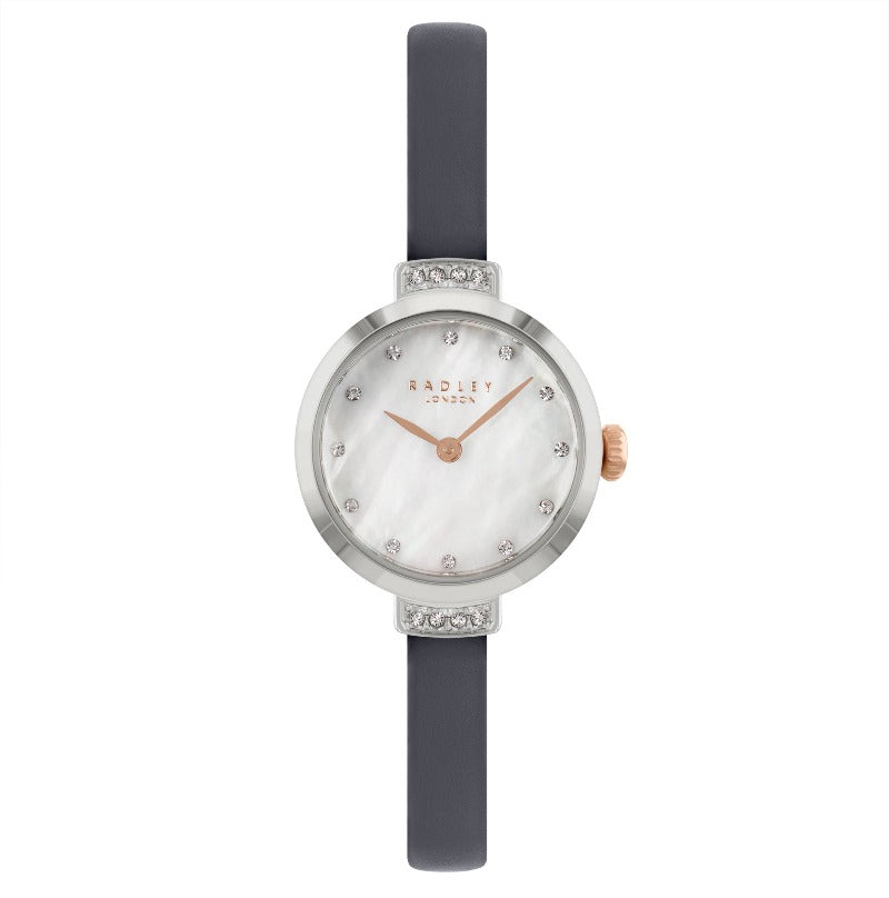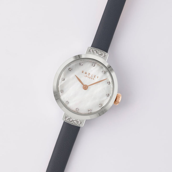 The Radley Ladies Watch, model RY21491, is a study in understated elegance. Its round case frames a dial of iridescent mother-of-pearl, shimmering with an ethereal, almost magical light. This captivating display is further enhanced by the delicate sparkle of carefully placed crystals, adding a touch of glamour to everyday moments.