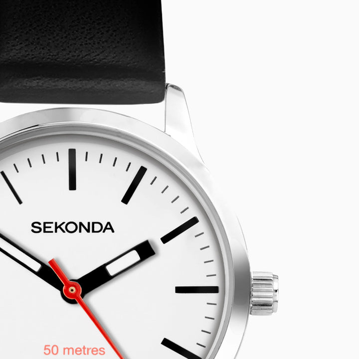 Beneath a crisp white dial, a precise quartz movement keeps perfect time, while the rich black leather strap adds a touch of timeless elegance. And because style is personal, the strap is easily interchangeable, allowing you to effortlessly adapt the watch to any occasion.