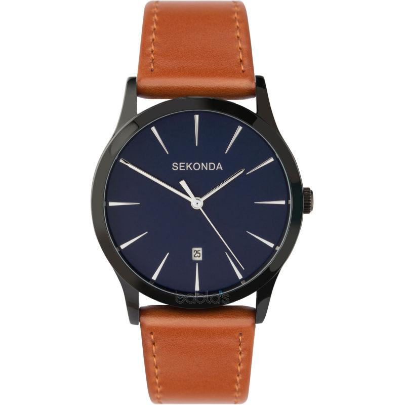 This Sekonda men's watch offers a striking contrast with its deep blue dial punctuated by crisp white baton markers.