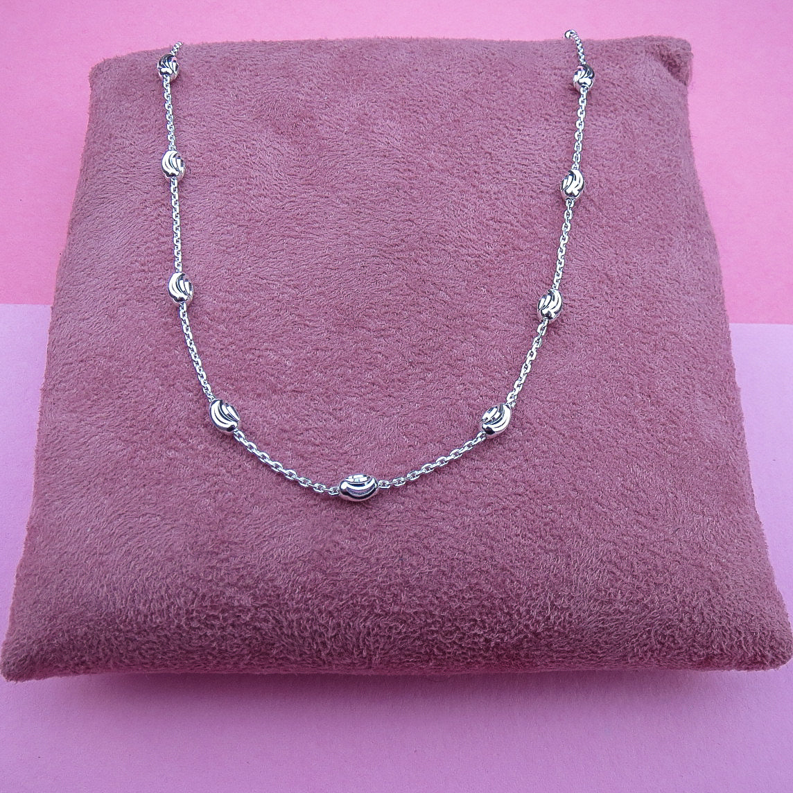 The necklace is finished with a classic spring ring clasp, ensuring a secure and seamless fit. The purity of the silver provides a cool, luminous quality against the skin.
