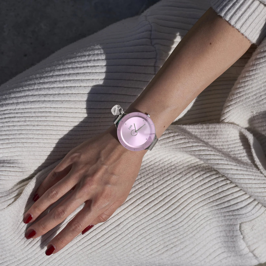 Completing the look, crystals mark the quarter-hour positions on the dial, adding a subtle yet captivating shimmer.
