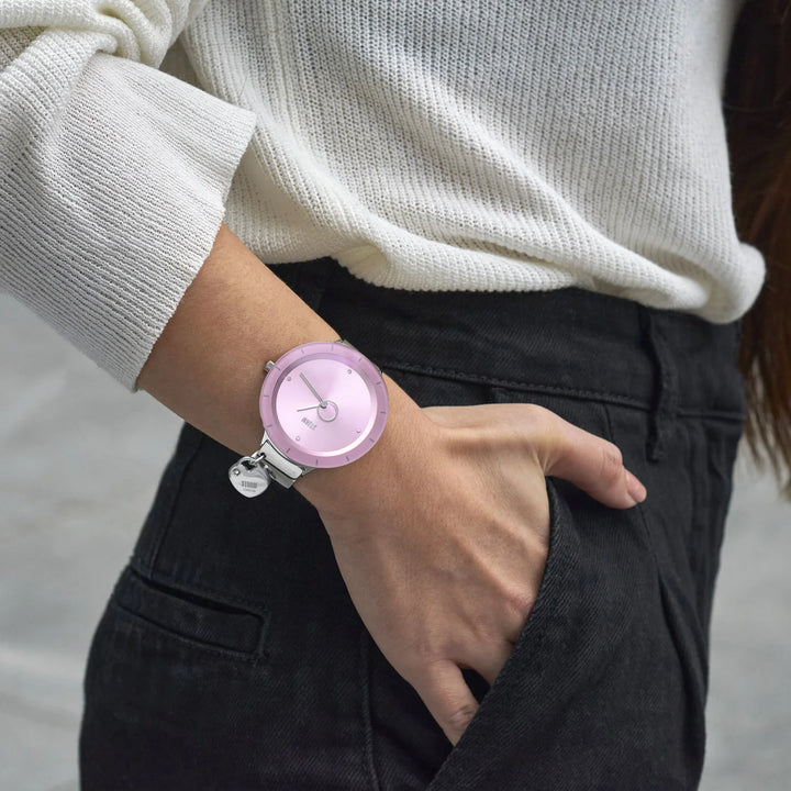 The highly polished steel bracelet adds a touch of timeless elegance, further enhanced by a delicate heart detail and a solitary, sparkling crystal.