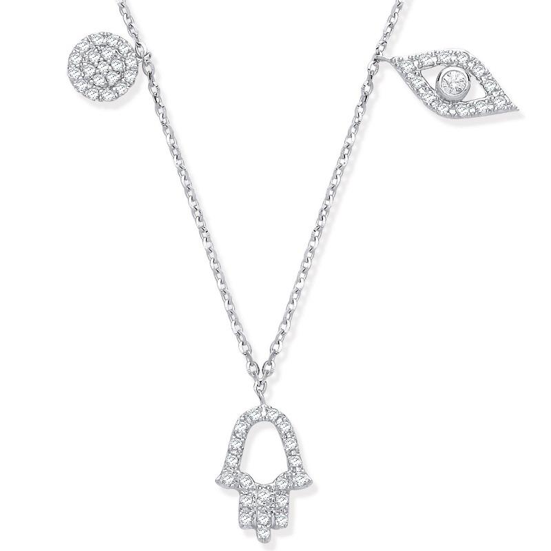 Crafted from gleaming 18ct white gold, this necklace features a symbolic Hamsa hand pendant. Within the palm of the protective Hamsa rests a dazzling Evil Eye, believed to ward off negativity and bring good fortune. The pendant, beautifully adorned with sparkling diamonds, hangs gracefully from a delicate chain, creating a piece that is both meaningful and captivating.